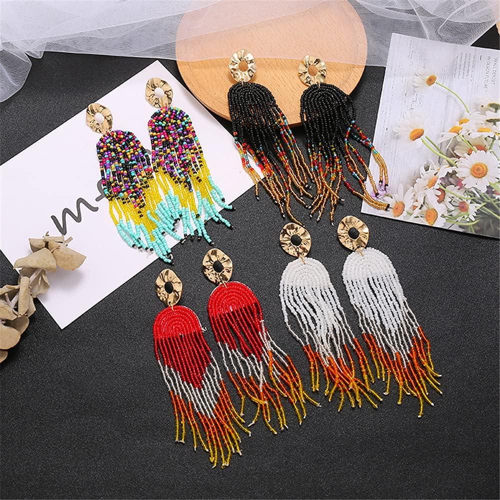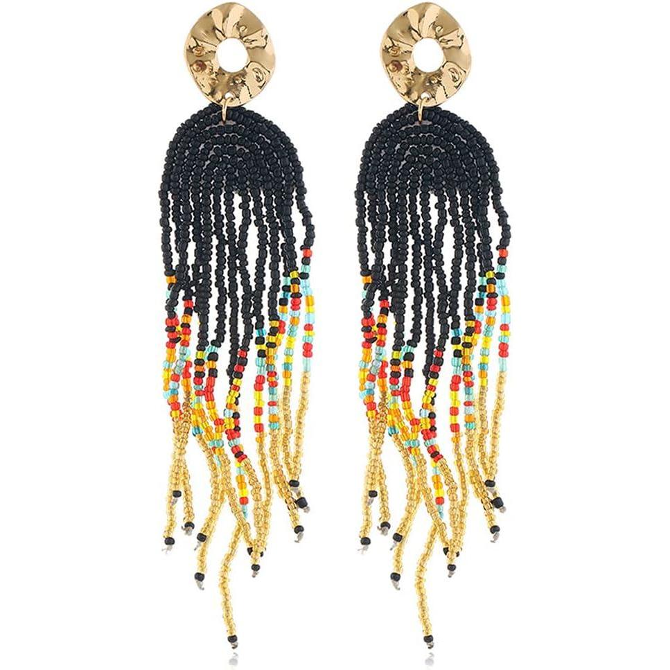 Bohemian Long Fringe Tassel Drop Dangle Earrings for Women Girls Hademade Ball Beads Chain Woven Gold Stud Statement Earring Chandelier Boho Tribal Exaggerated Y2K Jewelry (Black)
