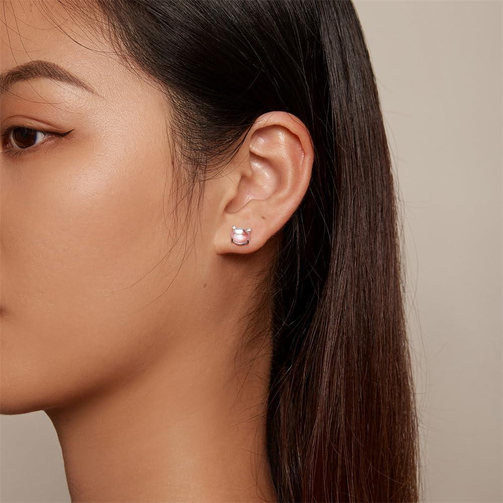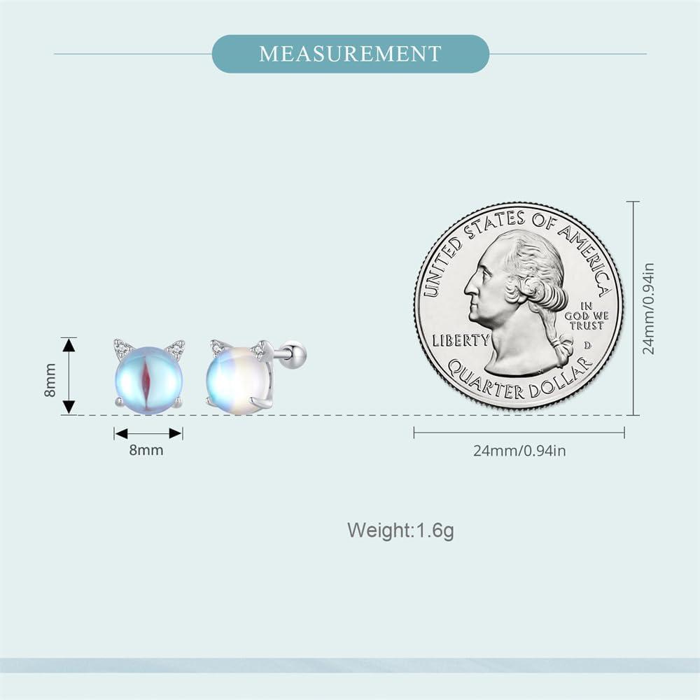 Cute Cat Moonstone Cartilage Stud Earrings for Women 925 Sterling Silver Hypoallergenic Crystal Birthstone Tiny Kitten Animal Studs Tragus Mini Ball Screw Back Piercing Jewelry Gifts for Daughter Niece