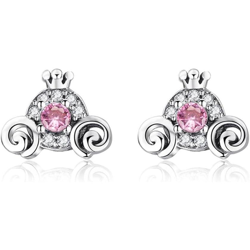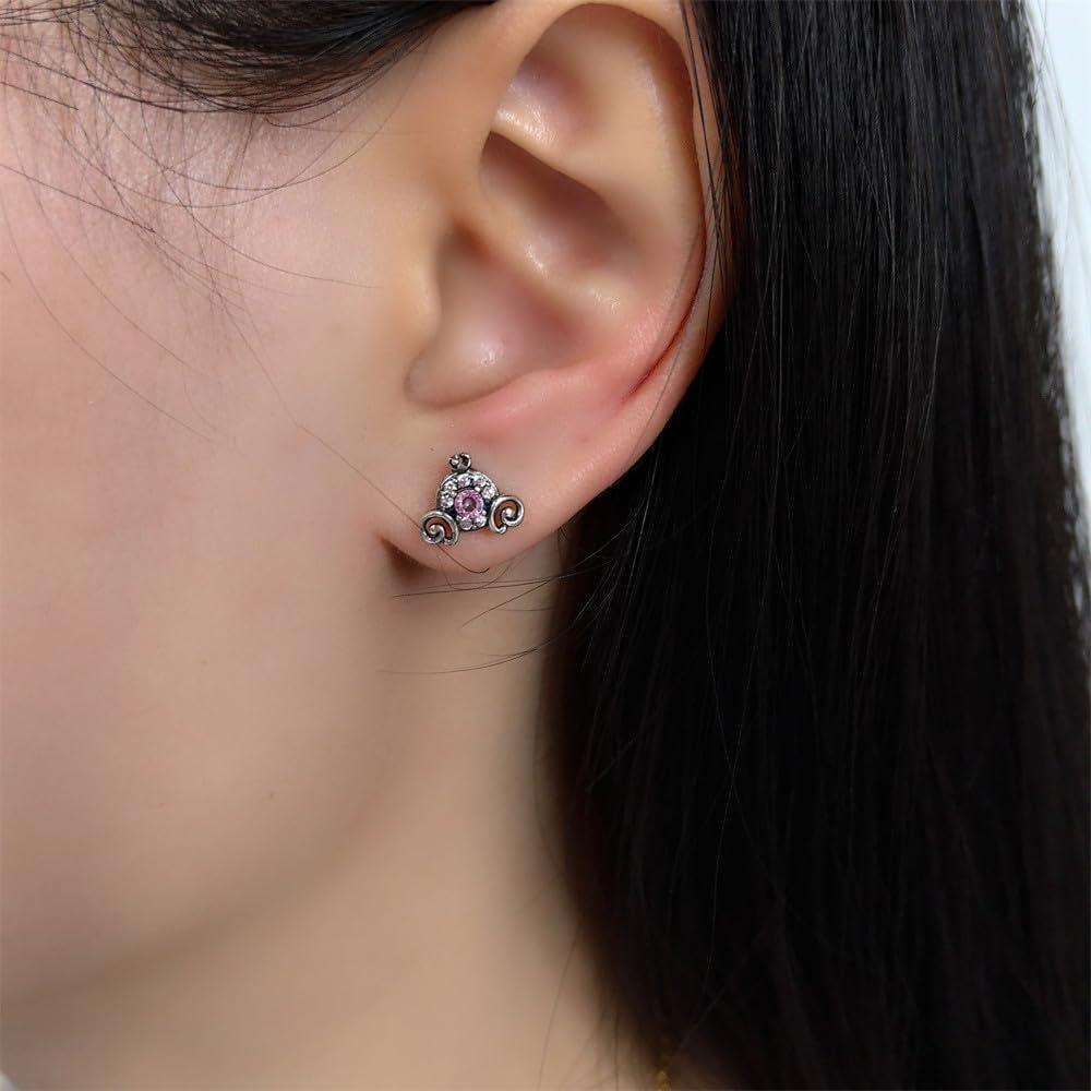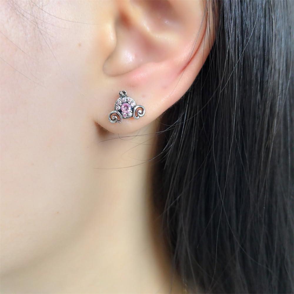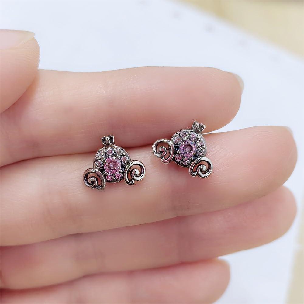 Cute Pumpkin Carriage Stud Earrings for Women 925 Sterling Silver Cubic Zirconia Vintage Lucky Princess Tiny Small Studs Cartilage Hypoallergenic Holiday Birthday Halloween Jewelry Dainty Gifts Daughter Niece(Pink)