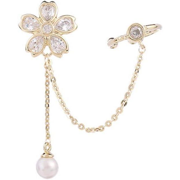 CZ Flower Cuff Earring Chain Shell Pearl Drop Dangle 925 Sterling Silver Piercing Post for Women Girls Small Cartilage Crawler Climber Stud Fashion Dainty Cubic Zirconia Jewelry 1 PC (Gold Plated)