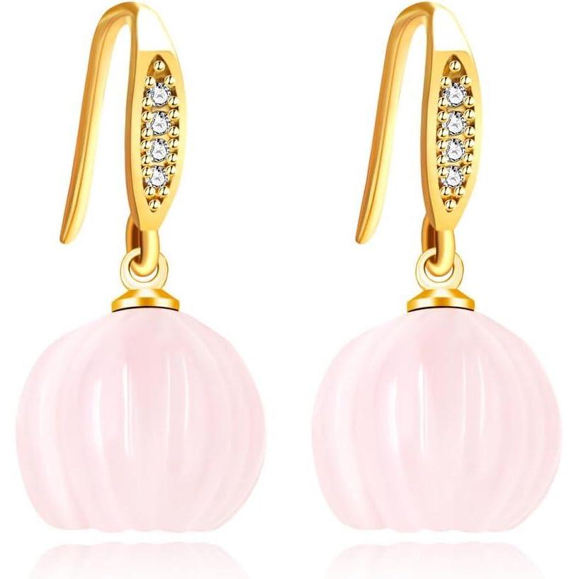 Add a touch of elegance to your jewelry collection with these delicate pumpkin dangle earrings. Featuring a polished gold-plated finish and sparkling CZ crystals, these charming earrings capture the festive spirit of fall celebrations. The dainty design includes a secure fish hook backing for comfortable wear. Perfect for Halloween, Thanksgiving, or any autumn occasion, these earrings make a stylish statement while remaining lightweight and versatile. The pink and white crystal accents create a sophisticated look that complements both casual and dressy outfits. These medium-sized danglers are thoughtfully crafted with prong settings to ensure the crystals catch and reflect light beautifully. Whether you're attending a holiday gathering or simply want to embrace the fall season, these earrings serve as the perfect accessory. They arrive ready for gift-giving, making them an ideal present for someone special or a delightful treat for yourself.