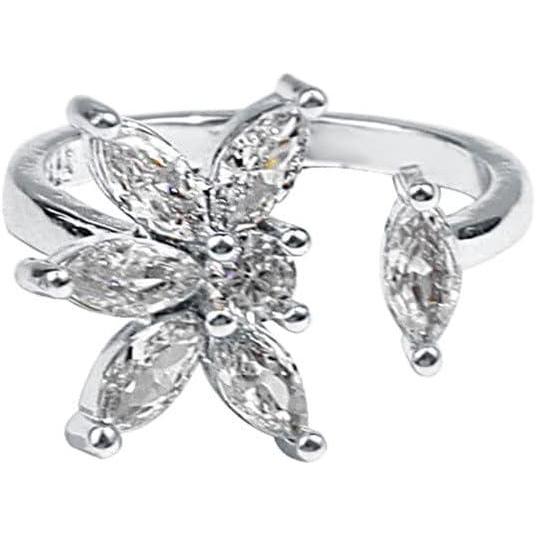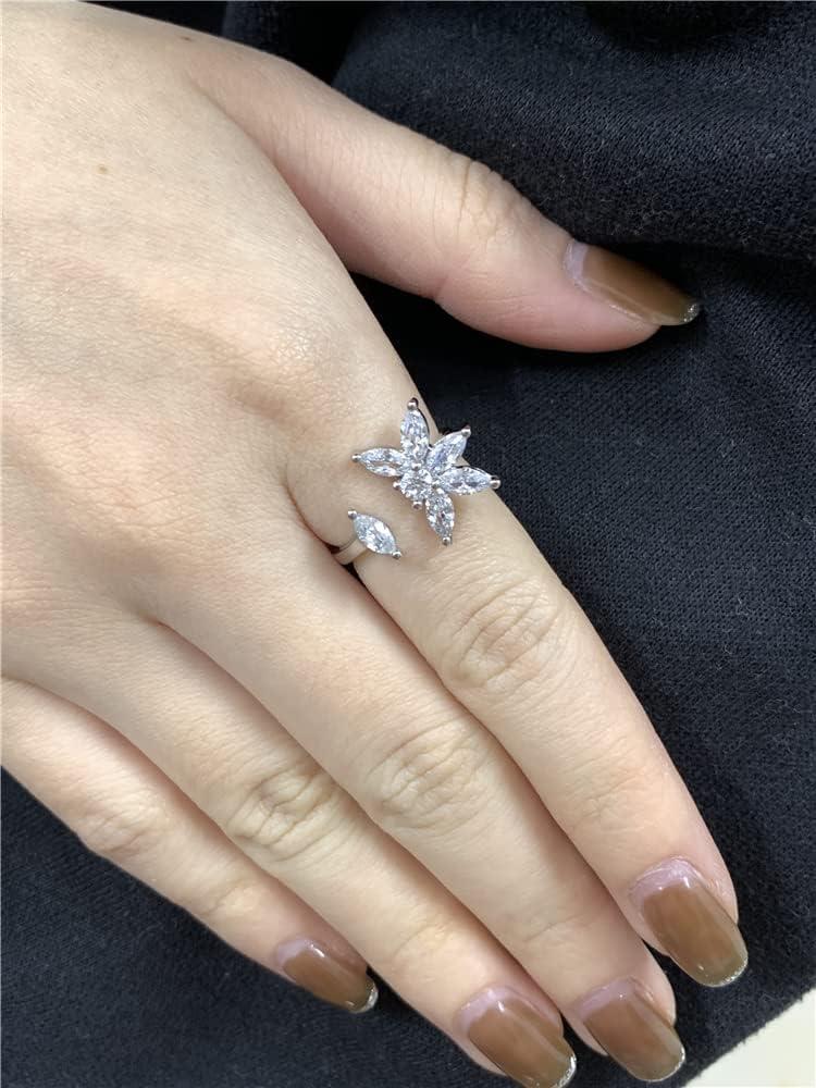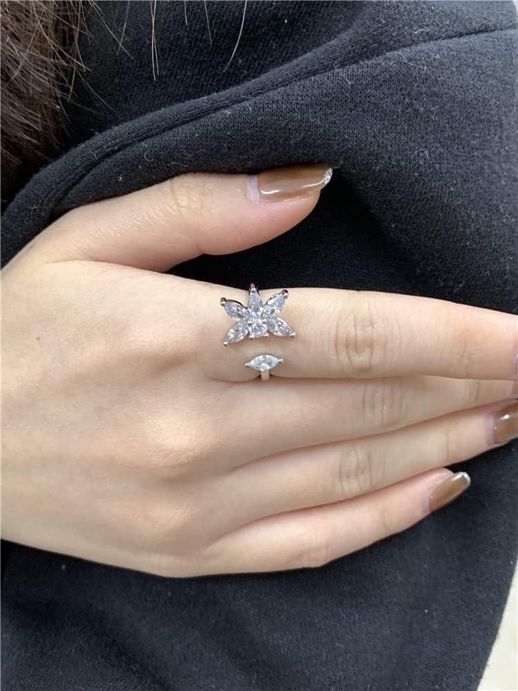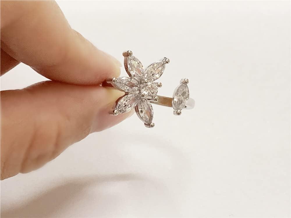 Dtja CZ Falling Petal Flower Wedding Ring for Women Silver Plated Rhinestone Statement Engagement Expandable Adjustable Open Wrap Finger Rings Comfort Fit Fashion Crystal Jewelry Valentine Birthday