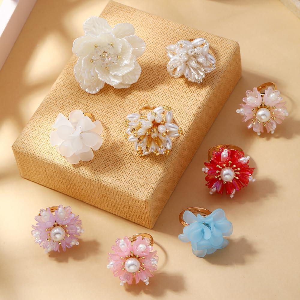 Dtja Elegant Shell Pearl Flower Statement Ring for Women Lady Artificial White Camellia Cherry Blossom Petals Adjustable Wide Wrap Rings Comfort Fit Delicate Wedding Holiday Party Jewelry