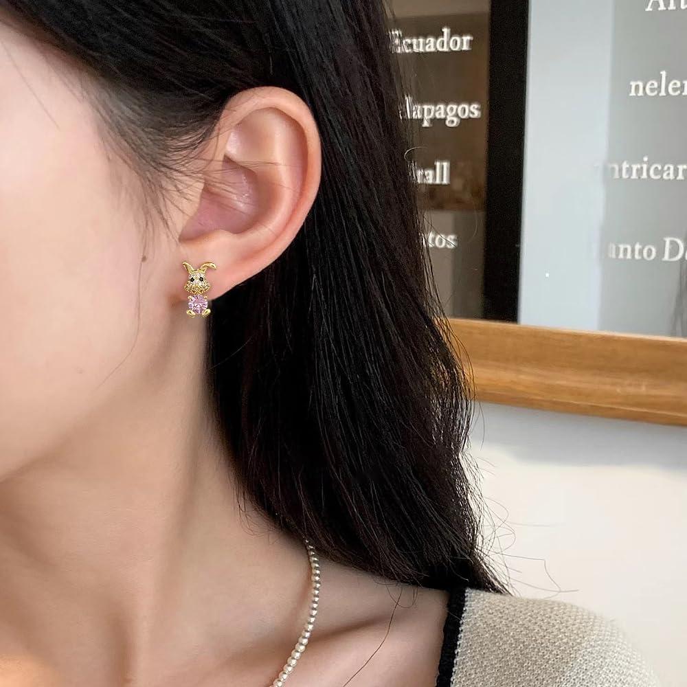 Dtja Gold Rabbit Stud Earrings Crystal Bunny Animal Pendant Necklace Jewelry Set for Women Stainless Steel Hypoallergenic Dainty Pink CZ Birthstone Adjustable Charm Chain 18" Birthday Jewelry Gifts