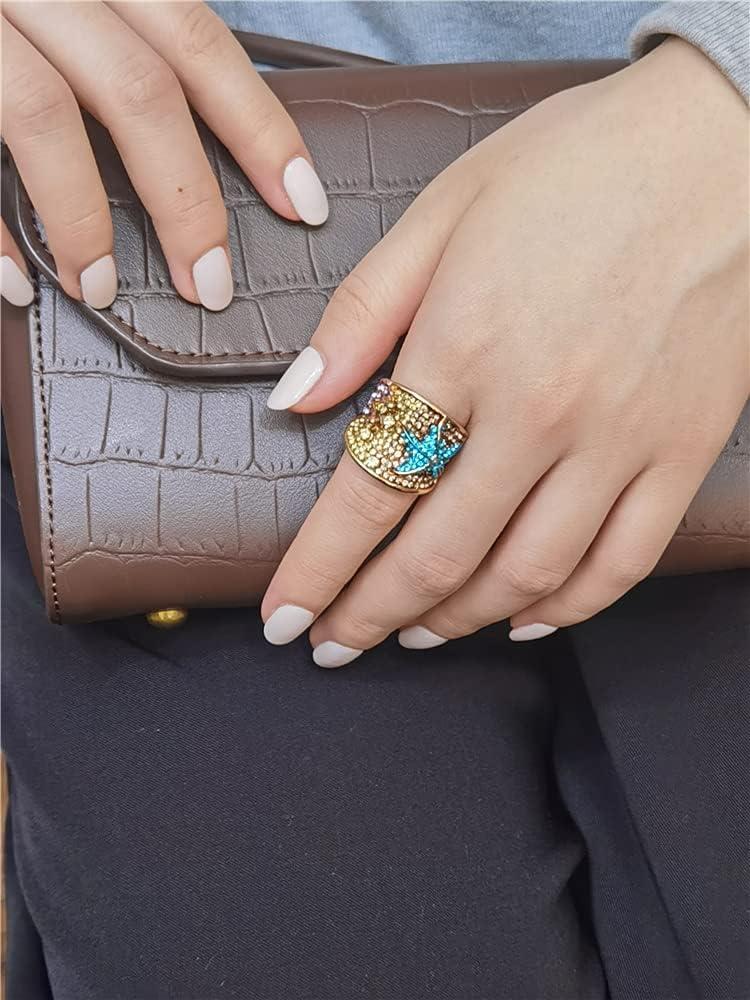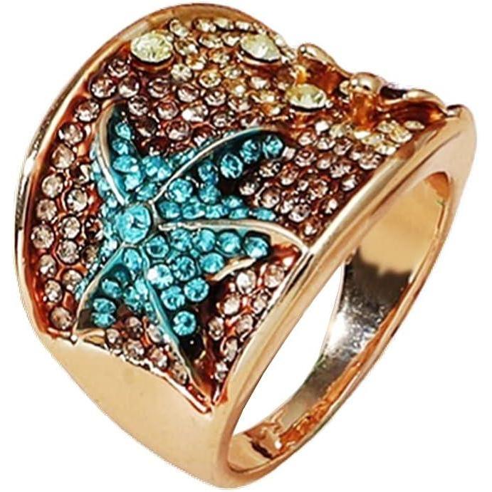 Ocean Starfish Statement Ring for Women Wide Vintage Blue Purple Crystal CZ Band Cocktail Party Rings Big Chunky Antique Exaggerated Jewelry Dainty