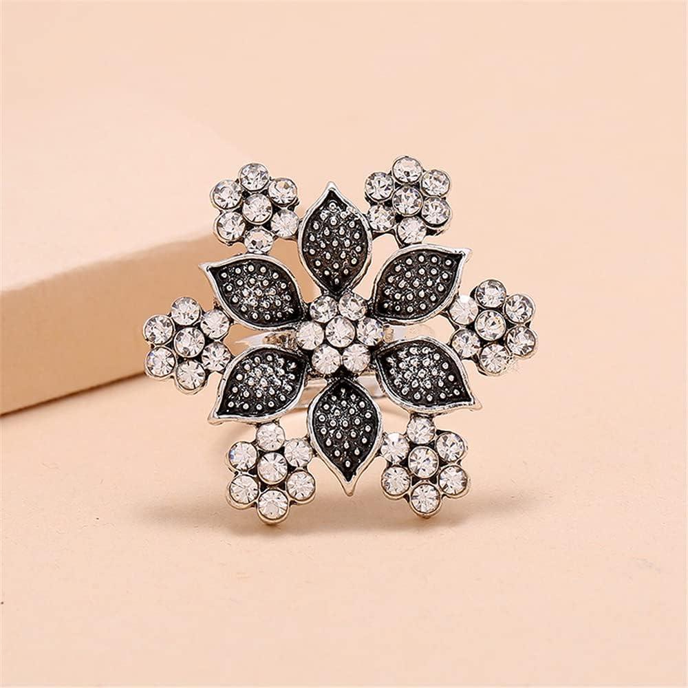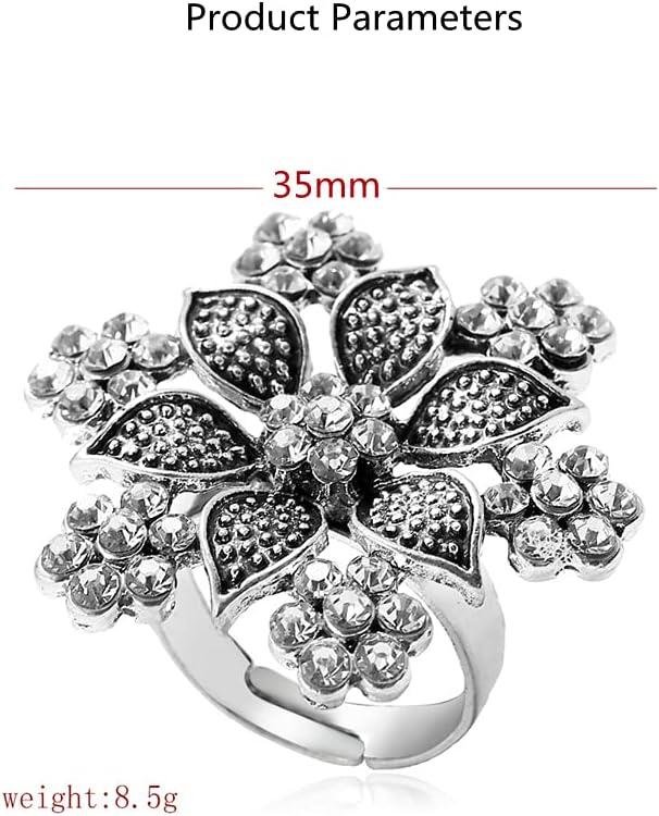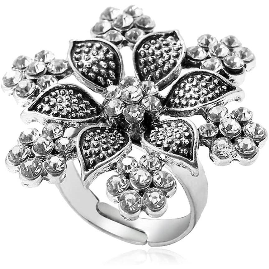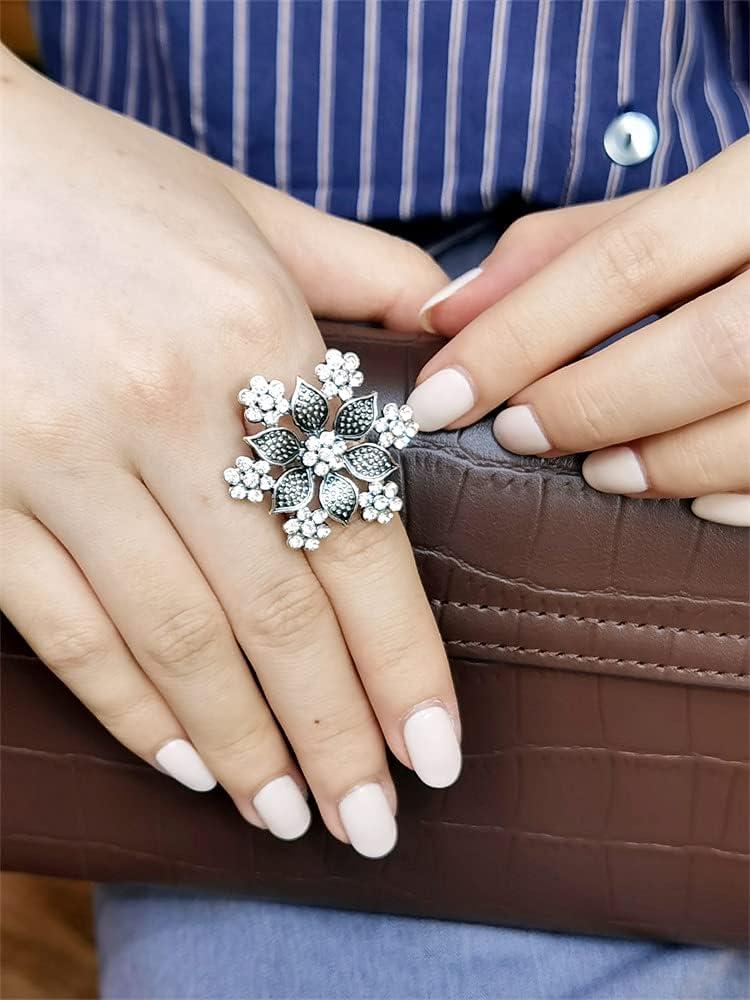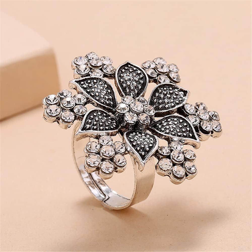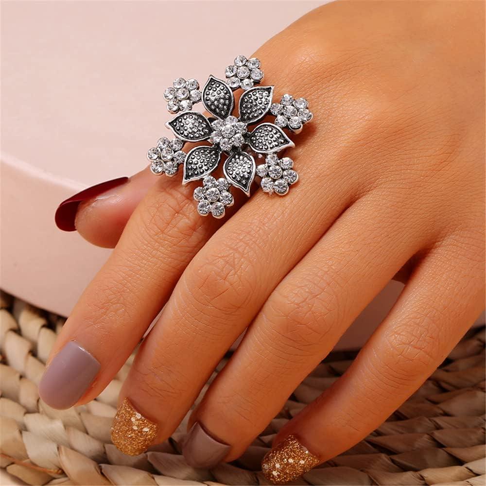 Vintage Big Flower Statement Ring for Women Girls Silver Plated Oxidized Cubic Zirconia Adjustable Expandable Snowflake Open Wrap Rings Comfort Fit Boho India Bollywood Rhinestone Wedding Birthday Party Jewelry