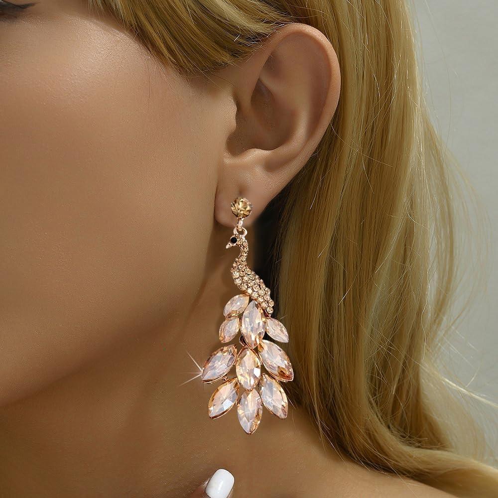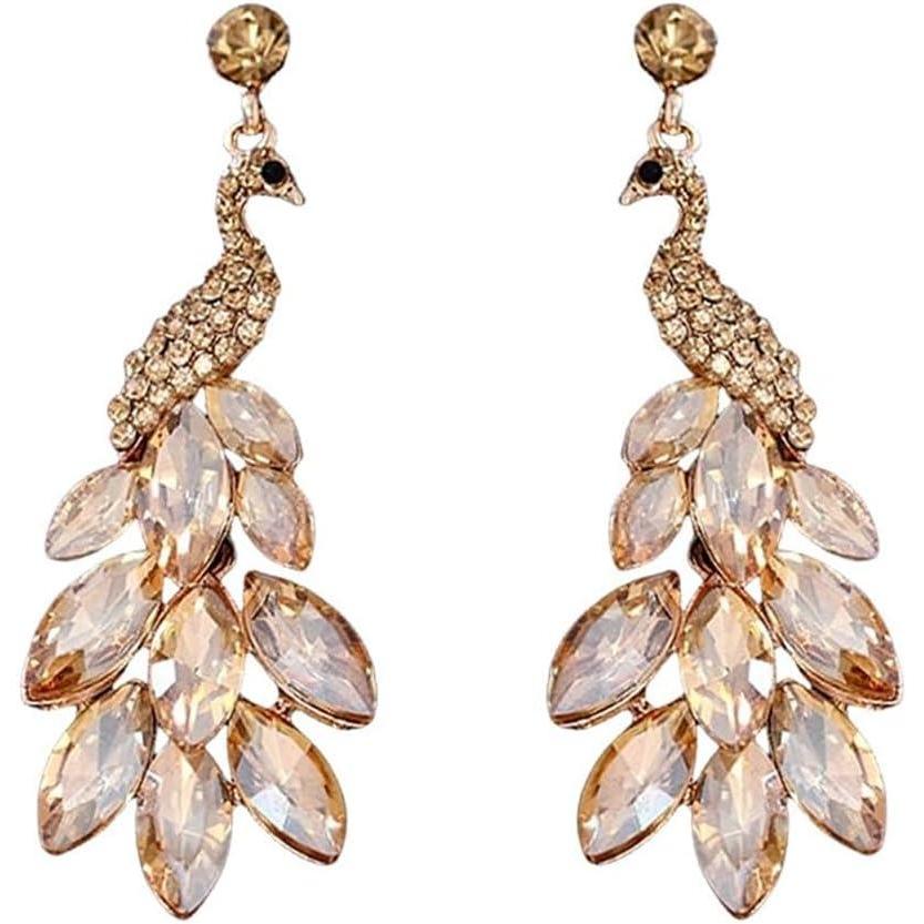 image:imageVintage Peacock Dangle Earrings for Women 14K Gold Plated Green Crystal Feather Peafowl Statement Drop Dangling Stud Earring Boho Exaggerated Birthday Holiday Jewelry GiftsChampagne
