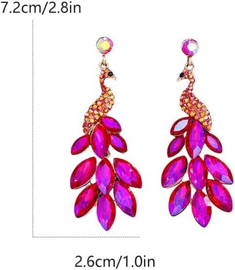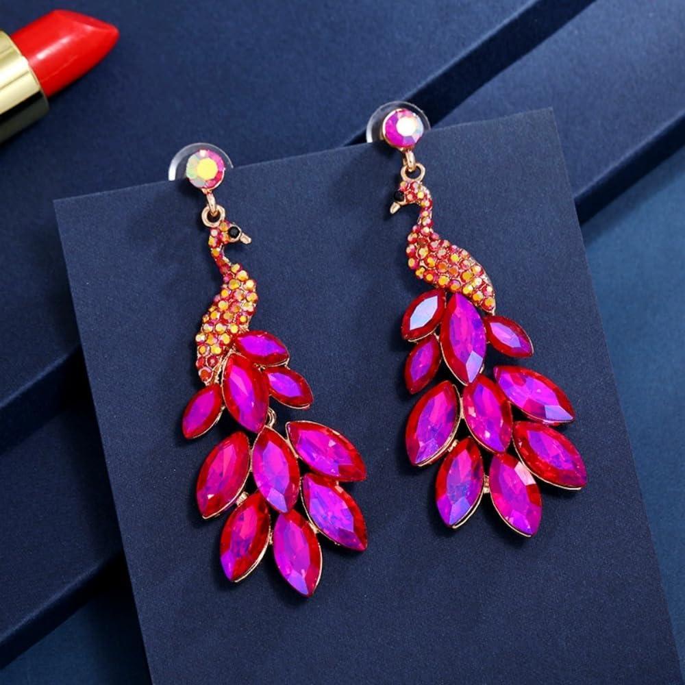 Vintage Peacock Dangle Earrings for Women 14K Gold Plated Green Crystal Feather Peafowl Statement Drop Dangling Stud Earring Boho Exaggerated Birthday Holiday Jewelry Gifts(Fuchsia)